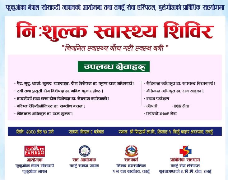 फुकुओका नेपाल सोसाइटीको आयोजना, तनहुँ सामाज जापानको सहआयोजना, भिमाद नगरपालिका वडा नम्बर १ को सहकार्य र तनहुँ सेवा हस्पिटलको प्राविधिक सहयोगमा भिमाद नगरपालिका १ किहुँ स्थित श्री सिद्धार्थ माध्यमिक विद्यालयको प्राङ्गणमा शिविर सञ्चालन हुनेछ । सन १९९५ सालमा स्थापना भएको यस सोसाइटीले नेपालमा यस प्रकारका कार्यक्रमहरु गर्दै आएको छ । यस सोसाइटीले यस अगाडी पर्वतमा स्वास्थ्य शिविर सञ्चालन गरेको थियो ।
